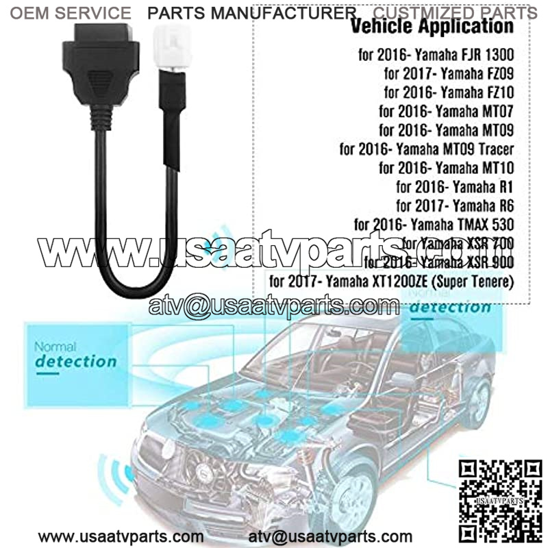 Fitment:for 2016- Yamaha FJR 1300for 2017- Yamaha FZ09for 2016- Yamaha FZ10for 2016- Yamaha MT07for 2016- Yamaha MT09for 2016- Yamaha MT09 Tracerfor 2016- Yamaha MT10for 2016- Yamaha R1for 2017- Yamaha R6for 2016- Yamaha TMAX 530for Yamaha XSR 700for 2016- Yamaha XSR 900for 2017- Yamaha XT1200ZE (Super Tenere)Function:check engine lightread the fault memoryReading of live engine data such as speed, rpm, temp, O2 sensor data, emissions, voltagesDiagnostic Cable for best Test Results.Feature:1. This 4pin motorbike OBD cable works with various programs / apps and even with standard OBD2 readers.2. This 4pin motorbike OBD cable is compatible with many of Yama haaa Canbus Motorcycles3. With the 4-pin to OBD2 adapter cable you can connect your Yama-ha a motorcycle with a CANbus compatible OBD2 diagnostic interface or ELM327 scanner.Installation:Plug and playPackage Including:1x 4pin OBD2 for Yamaha cable