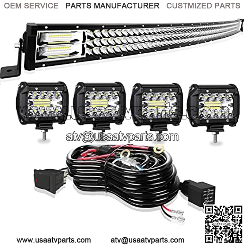 ??Package Included??: 1 x 52Inch 711W Curved Tri-ROW Led Light Bar,1 x Rocker Switch Wiring Harness , 4x 4Inch 60W led Work lights ,necessary mounting brackets, 1 year warranty.