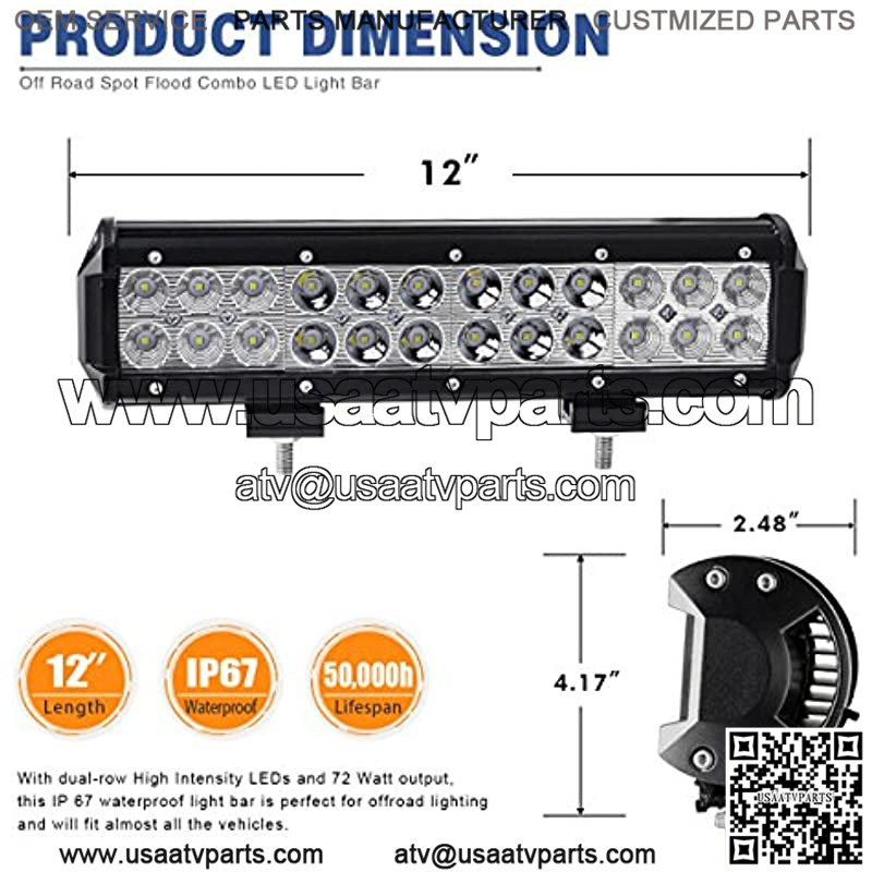 ??High Performance??: Withstands harsh environments thanks to the die-cast aluminum housing which provides strength and durability. An upgraded PC lens surface with high light transmission. Our 12 inch 72W led pods have a 50,000 hour life span and are IP67 rated waterproof, dust-proof, quake-proof, anti-corrosion for harsh environment.