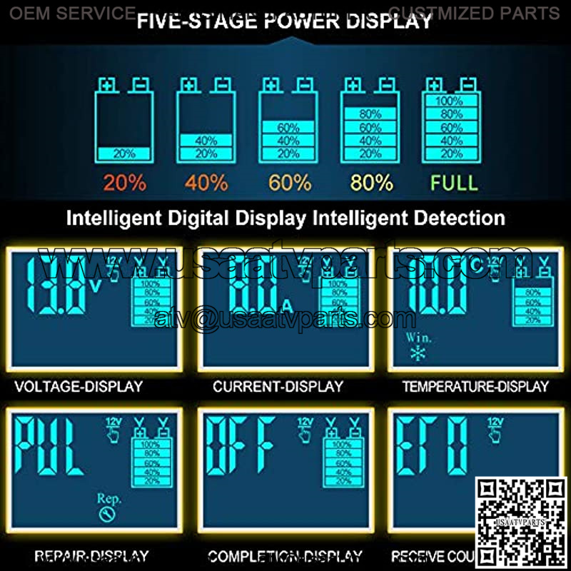 Intelligent Digital Display Intelligent Detection: The screen displays charging status and battery status, charge voltage, charge current, inside temperature, battery full, summer mode and winter mode, etc.