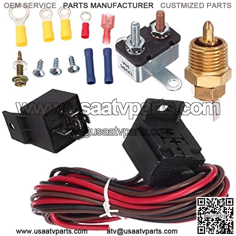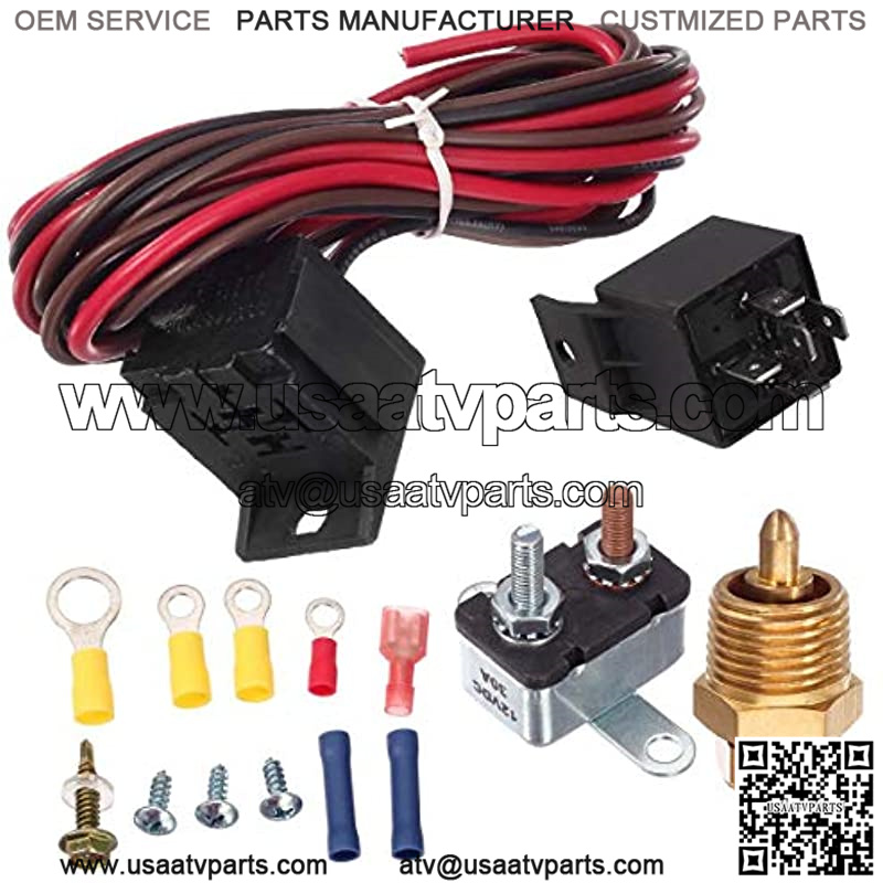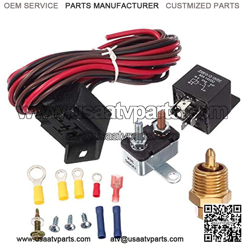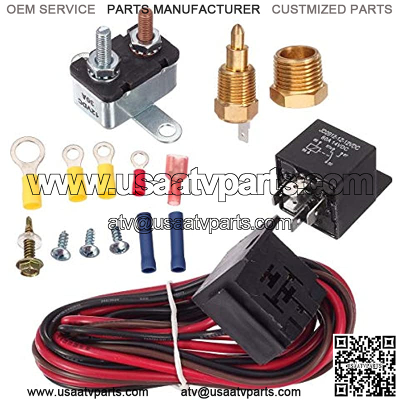 This kit includes everything you’ll need to hook up to your fan, includes a brass adapter to install the sending unit, wires, relay switch, circut breaker, terminals and mounting screws.