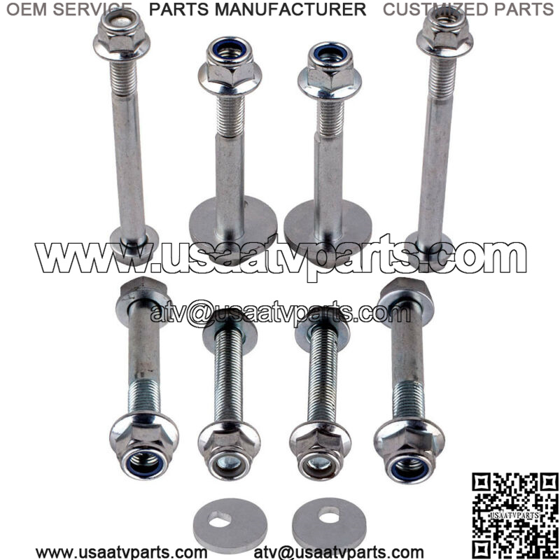 This complete front upper and lower control arms mounting hardware kit includes the cam bolts, cam washers, and lock nuts for the front ends of the front lower control arms as well as all of the mounting bolts and nuts for the rearward ends of the front lower control arms and both ends of the front upper control arms.