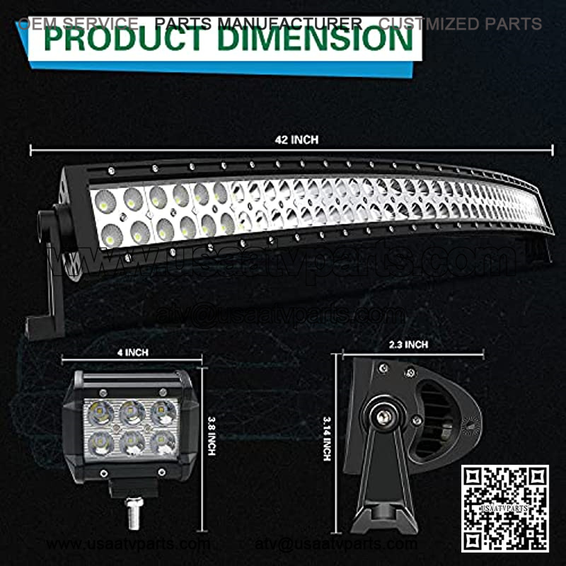 ??Package Included??:1 x 42Inch 240W Curved LED light bar, 2 x 4Inch 18W Spot pod lights, 1 x rocker switch wiring harness kit. Including Installation Tools (Mounting Bracket + Screws). ONE YEAR WARRANTY. 100% satisfication aftersale services.