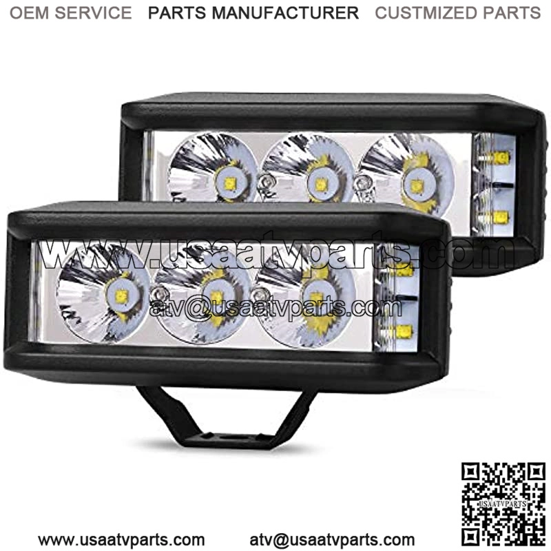 ??Side Light Design??Both sides are equipped with side lamps, aiming to widen driver??s line of sight.LED side shooter light pods make the vision on both sides clearer,which increases the safety of driving at night.??Super Brightness??Flood & spot beam combo with 7PCS upgraded LED chips,emitting 6000K 6000LM bright cool white light and reaching 1LUX@118M lighting distance.??IP67 Waterproof Rate??The off road lights are wrapped in a seamless protective shell,which has excellent waterproof,dustproof and shockproof performance,and can completely resist the harsh environment of off-road driving.??Rapid Cooling System??12PCS thin radiator fins on the back make the driving light cool down quickly to get optimal heat disation status,effectively extend its lifespan to be 50000hrs.??Wide Applications and Superior Service ??LED pods is compatible with most of DC 9-30V Off Road,Truck,SUV,ATV,Motorcycle,Boat,etc. Also can be used for garden,backyard and construction lighting.We offer ??ONE YEAR” warranty,p