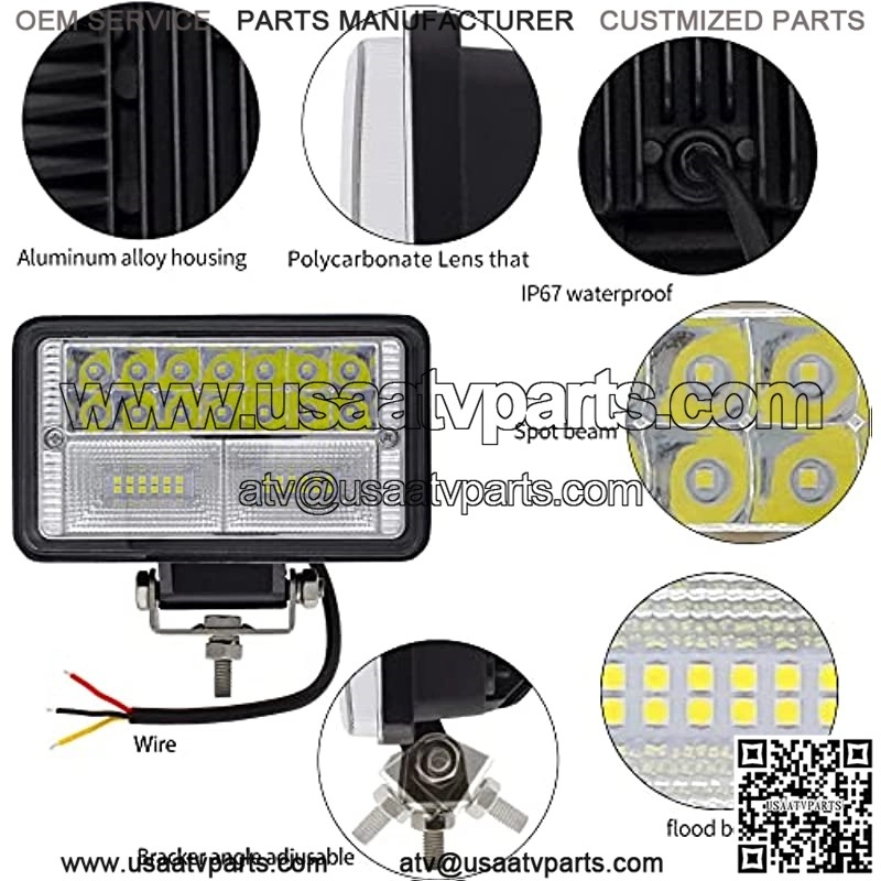 Wide Application: come with necessary accessories for easy installation. widely used for power sports (UTV, ATV, RZR, Dune Buggy, Sand Rails), SUV, Pick-up, Ford, mining, agriculture (Trailer, Forklift, Excavator, Dozer, Tractor)Super bright : led tractor lights with advanced led chips provide brighter beam for clear vision. This will better meet your needs, hugely improve the safety of driving.High Quality: led work auxiliary lights is made of thickened diecast aluminum heat sinks and sealed high-level gasket around the lens, maximizes surface area for optimal cooling enhance. the long life span up to 50,000 hours.Waterproof, Dustproof and Shockproof: Built with IP67 rating, meaning that it is completely secure against both small dust particles. it can work normally under any harsh environments. All lights are burn-in and waterproof tested before leaving the factory.Buy With Confidence : We offer you 12 months full warranty as well as lifetime customer support and excellent after-sale