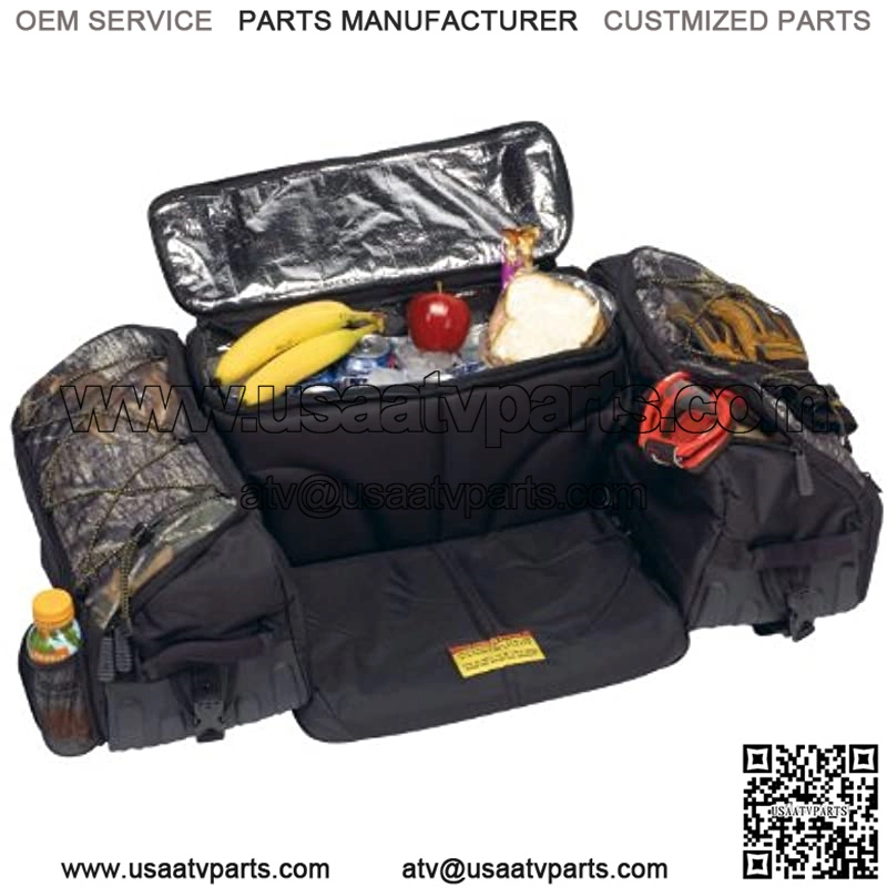 ATV Matrix Seat Rack Bag in Pursuit Camo pattern fits most ATV racks using reinforced buckles. 3-piece zippered bag design including center cooler and UV coating. Padded backrest and seat pad for added comfort.