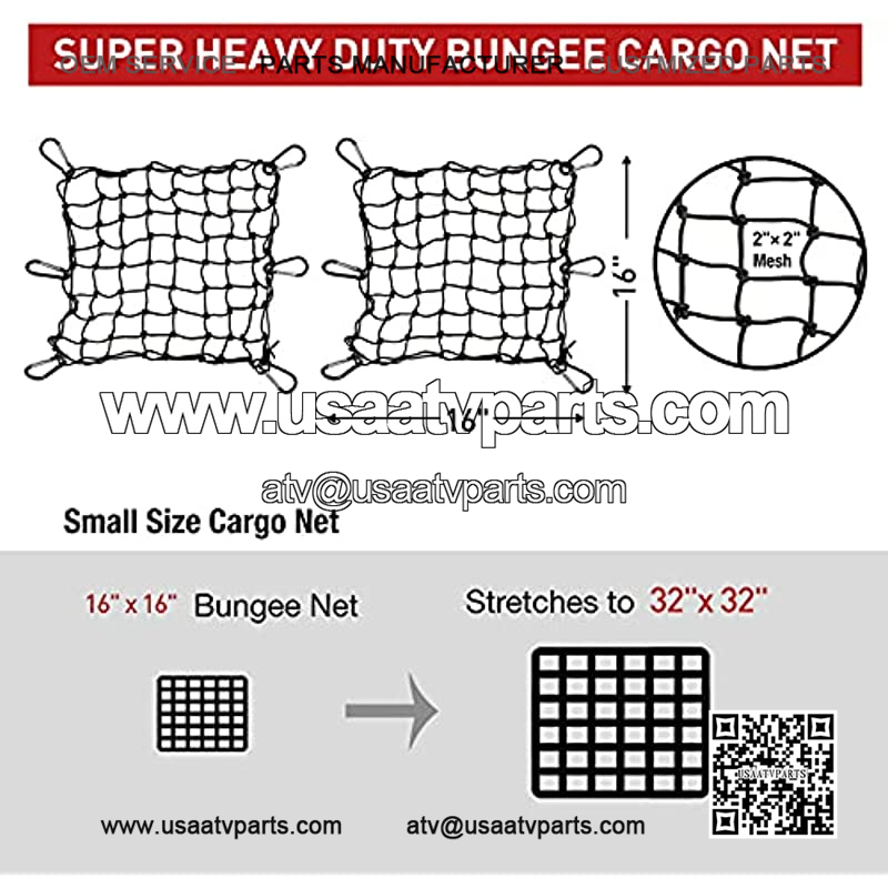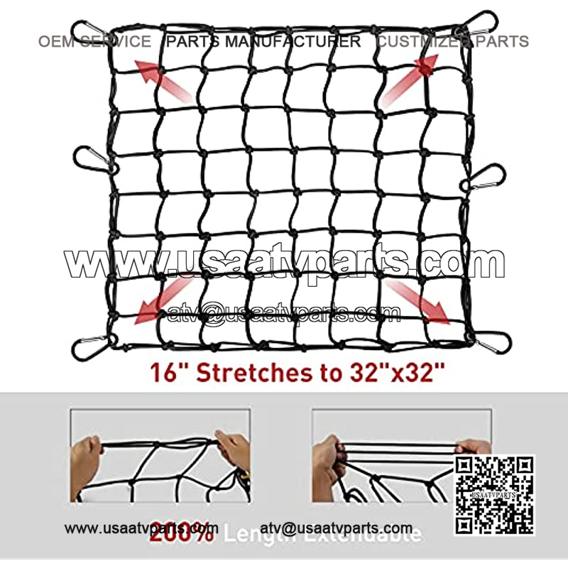 ??PREMIUM LATEX BUNGEE MATERIAL??The 16″x16″ bungee cargo net is made of 5mm thick high-quality latex bungee, much more durable than the normal rubber, covered with high-strength nylon for strong elasticity and toughness, can be streched to 32″x32″, 200% length extendable, even in tough and extreme weather conditions.