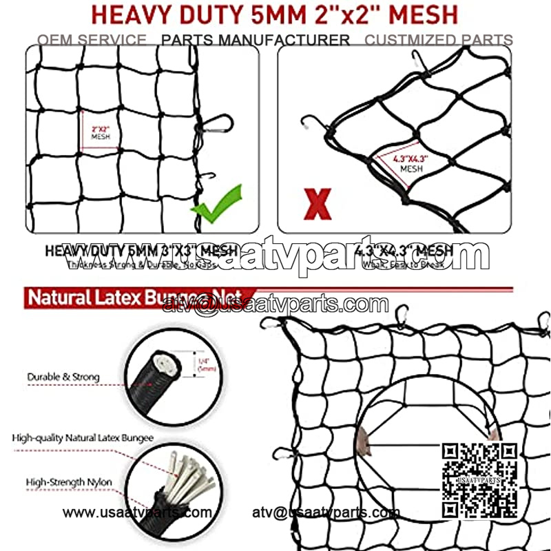 ??SMALL MESHES??Tight 2″ X 2″ grid netting with 5mm diameter of premium latex bungee cord, the knot is firm and not easy to fall off, extremely heavy duty to bear up a strong pull, securely keeps small or big items in place, provide extra strength and protection. This cargo net will provide a more stable guarantee to prevent small items, but also for large items from falling in the transport.