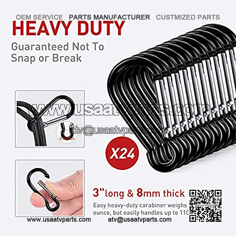 ??6 pcs METAL CARABINERS??6pcs heavy duty durable aluminum alloy hooks, more solid than those easy-broken plastic hooks. Just move the hook to any fixed buckle on the motorcycle, you can safely tie up the cargo of the big truck.