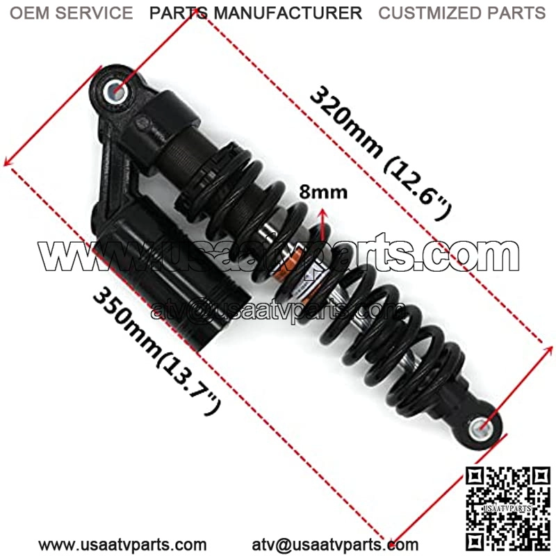 DimensionFactory Air Pressure: 0.5MpaMaximum Air Pressure:0.7MpaTotal Length: 350mm(13.7″)Distance from eye to eye: 320mm (12.6″)Spring Thickness: 7mmSpring Width: 60mmTop and bottom hole diameter: 10mmMaximum load: 200 kg (??440 lbs)Installation Type: Eye to Eye
