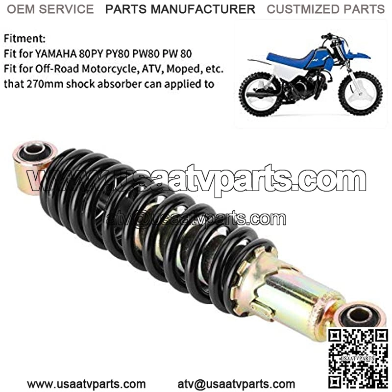 ??Applicable car model??This motorcycle shock absorber is specially fits for Yamaha 80PY PY80 PW80 PW 80, also suitable for Off Road Motorcycle, ATV, Moped, etc. that 270mm shock absorber can applied to.