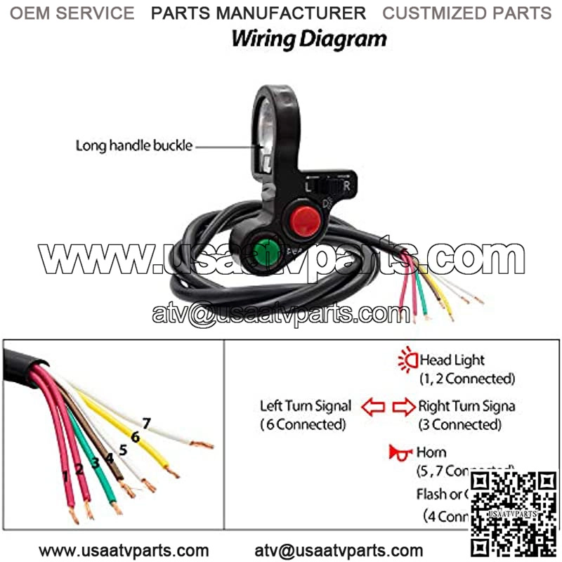 Wire Diagram:2 X White wires = Horn (green button) 2 X Red wires = Head Light??red button?? 1 X Yellow wire= Left Turn Signal 1 X Green wire = Right Turn Signal 1 X Brown wire= Flash or Ground wire for Turn Signal Lights