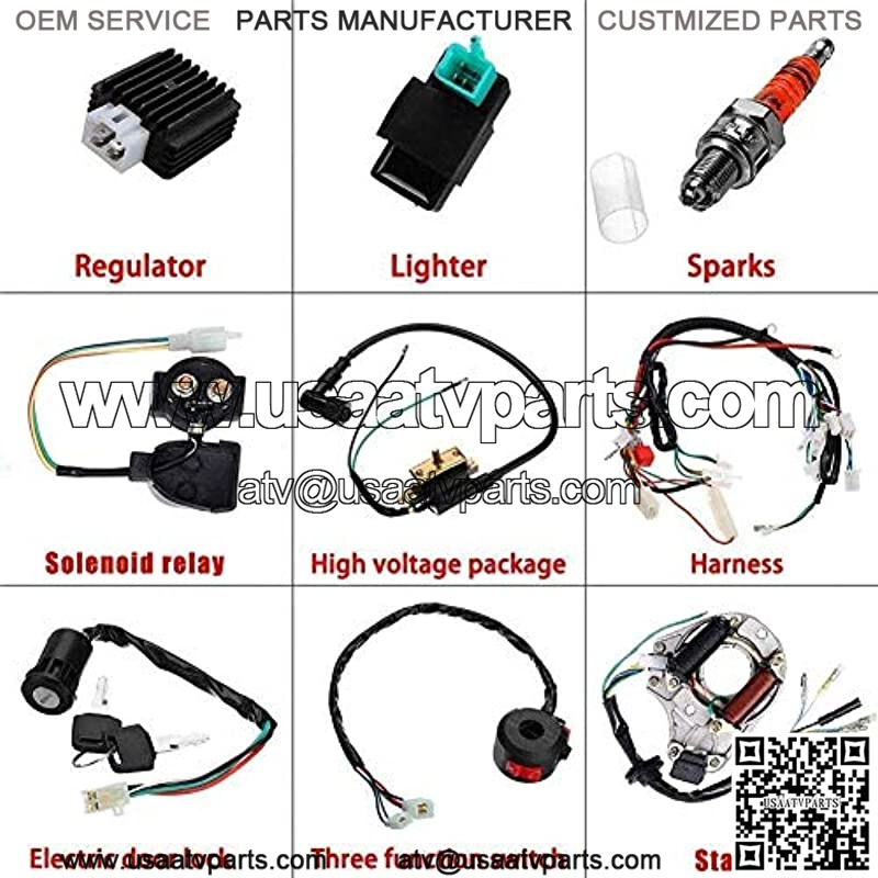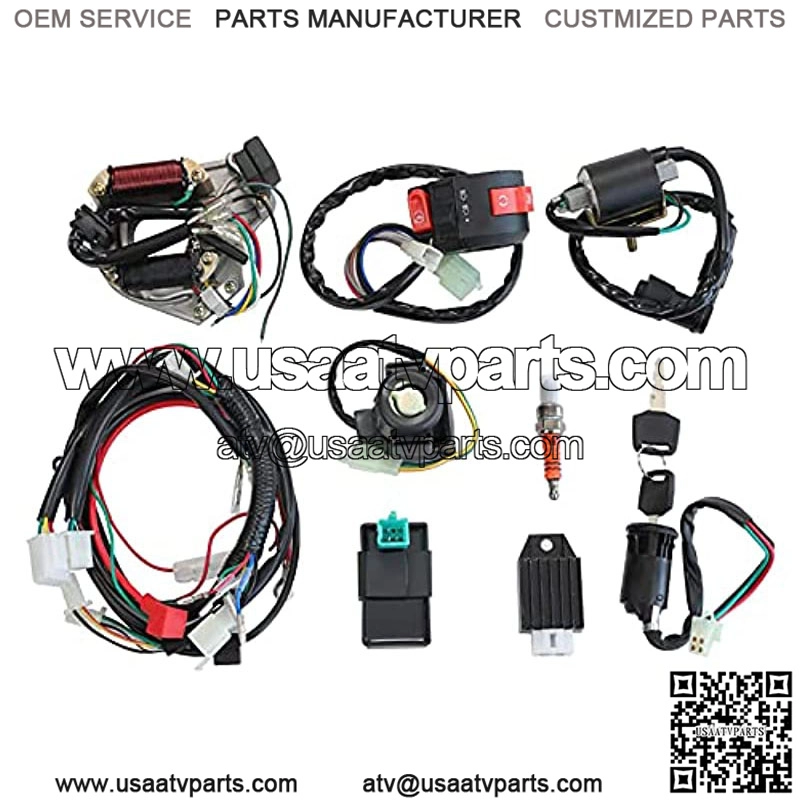 Complete electric start engine wiring harness include 1x ATV Wire harness,1x CDI(5Pin AC),1x Solenoid Relay,1xRectifier (Voltage Regulator) ,1x Ignition Switch (2 keys, waterproof),1x Upgraded Multi-functional ATV Switch,1x Stator (Magneto Generator),1x Ignition Coil with lead and 1x Spark plug.