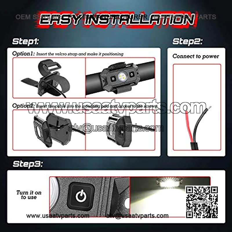EASY INSTALLTION – We provide 2 ways for easy installation. Option 1: Use curved or flat mounting pad to install on any curved or flat place. Option 2: Use adjustable velcro strap to mount it on any bar within 4 inch diameter. Then connect the wiring harness to power supply directly. They can be mounted on virtually anywhere.