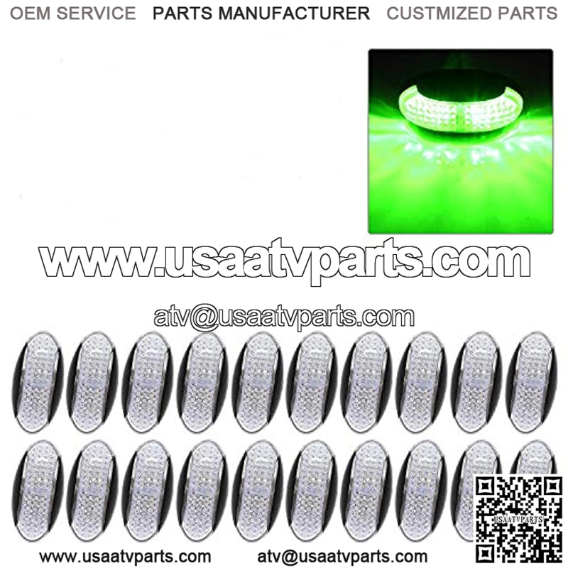 You will receive 20 pcs of Original Side Led Marker Fender Light with Green light & Clear Lens 4 LEDs Multi-Voltage 10-30v DC come with 2 years warranty on free replacement in case of defect by factory. High quality PC lens & Plastic Housing