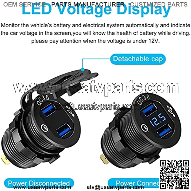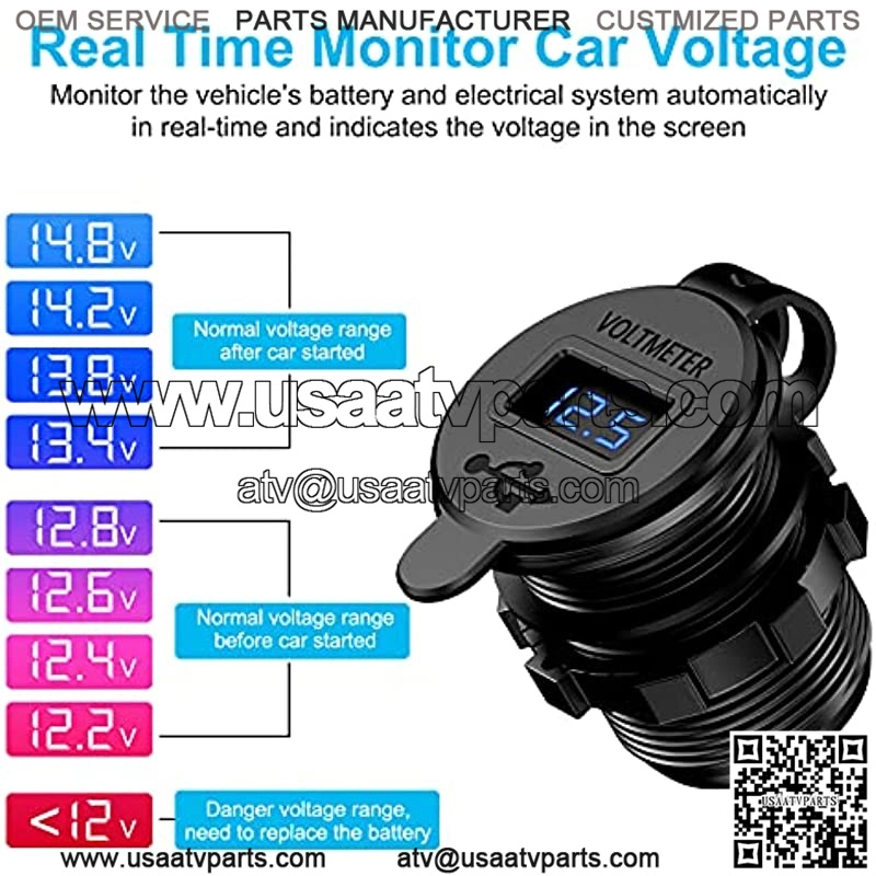 charges two compatible devices up to 4 times faster simultaneously than traditional charger. Car charger adapter provides protection against overload, overvoltage, overcurrent, overheat and short circuit.comes with a built-in 10A fuse wire can better protects your battery.(NOTE: USB car charger quick charge is only supported by the fast charge devices.)Aluminum Casing??Made of Aluminum alloy with better heat disation, which has advantage of non-flammable, wear resistant and good stability. Besides,its protective cap design enables it life splash-proof and dust-proof, it not only can use on car but also an excellent accessories for Golf Cart, Boat, ATV, motorcycle, bike, truck, RV, etc.Digital LED Display??This car charger builts in digital blue LED voltage monitor, displays the real-time voltage status of your vehicle??s battery,so that you could know the health of battery while driving and avoid voltage abnormal issue. Please pay attention when the voltage is under 12V.Easy Installati