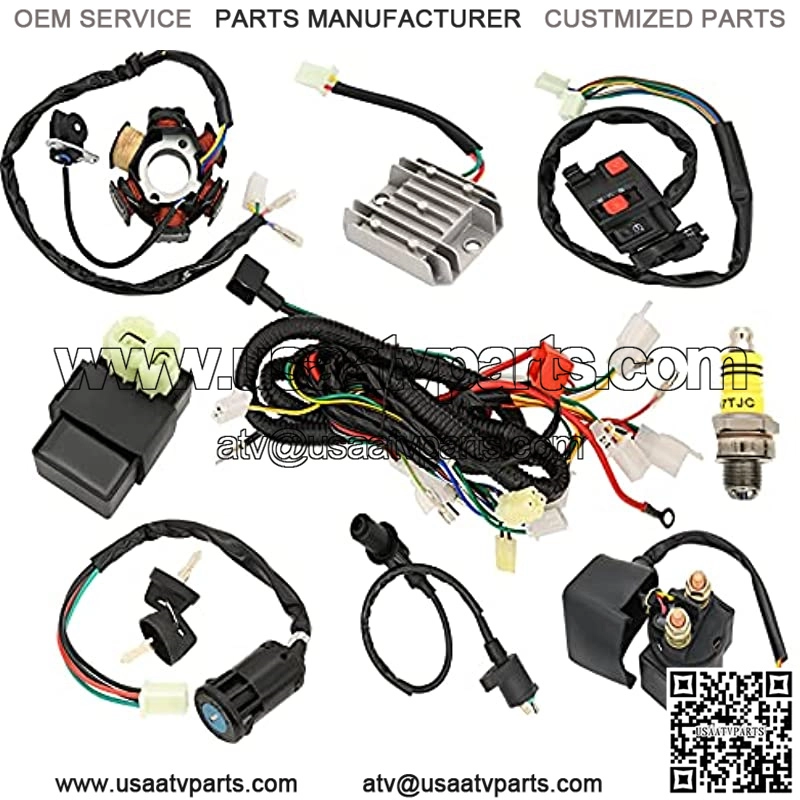 This complete electrics wiring harness wire loom assembly fits almost all years Chinese made electric start upright engine 49cc 50cc 70cc 80cc 90cc 100cc 110cc 125cc engines. The complete wiring harness kit compatible for ATV, Coolster, Quad Bike, Dirt Bike, Pit Bike, Go Kart, Kawasaki KLX, 4 Wheelers, Scooter, Buggy, Motowork, Dune, Taotao.