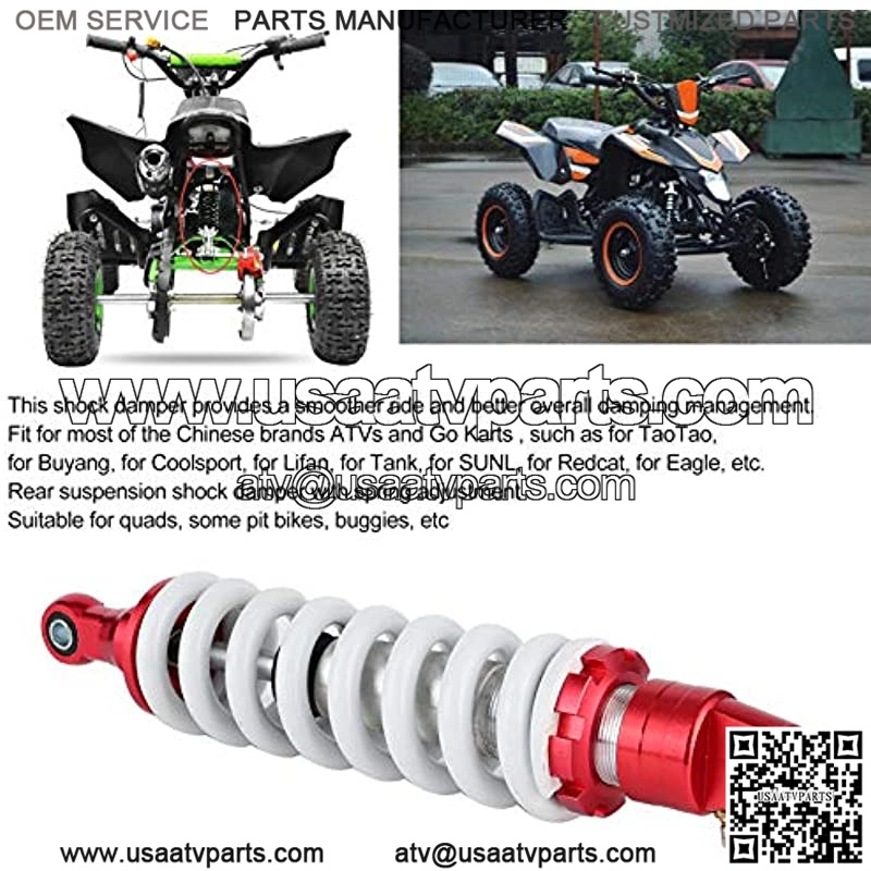 Compatible: 100% brand new high-rear shock absorber, suitable for most Chinese brand ATV and Go Karts, such as TaoTao, Buyang, Coolsport, Lifan, Tank, SUNL, Redcat, Eagle, etc. Rear suspension shock absorber with spring adjustment device, suitable for four-wheeled motorcycles, some off-road vehicles, off-road vehicles, etc.