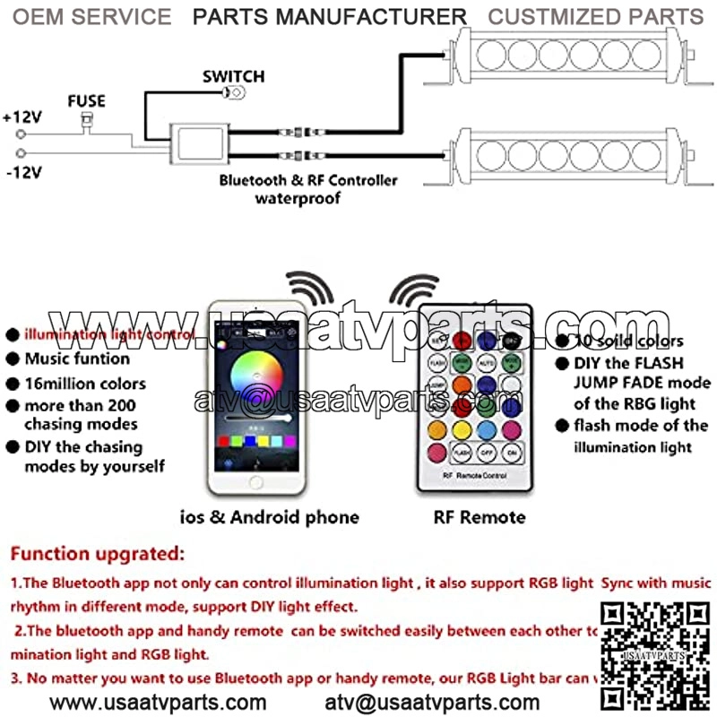New THIN DESIGN ?C Slim single row LED LIGHT BAR with color chasing halo inside. The Halo light bar provides powerful lighting in a small compact size, making it fitting for a more flexible installation and reduced wind noise. And it also can be controlled by Bluetooth APP on Android or IOS, support RGB light effect Sync with music rhythm in music mode and DIY changing lighting effect.You can switch the remote to Bluetooth app control at any time very smoothly to avoid the handy remote missing and come with Light & strobe function. High Quality 5w*6pcs LEDs premium Arc-leds with deep 4D reflector cups, it emits brighter and farther illumination distance, Clearly Light up your Off-road Truck Way!Brightness & Strobe – Comes with a wireless remote and Bluetooth controller, you can freely control the halos on/off, color changing, brightness & speed adjustment and Chasing Mode at any time. All of our RGB Light pods and RGB Chasing Light bar can be synced automatically once hook them up.Multi
