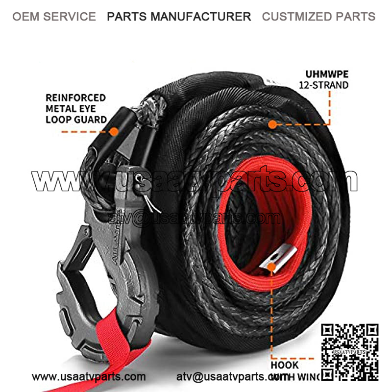 Product Includes: 3/8 Forged Winch Hook(35500 lbs) + 1/2 inch x 92 ft (31500 lbs) Bold winch rope + 5ft Sliding Protective Sleeve, can effectively prevent the Winch Rope from Wearing, Overheating and Slipping + Come with Hook Safety Pull Strap, pull out the winch rope more safely.