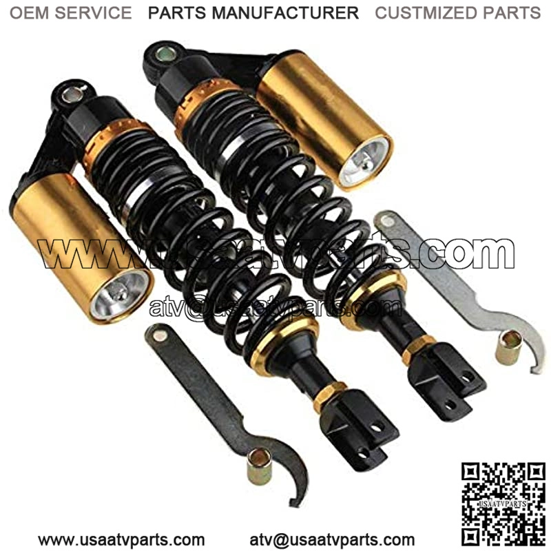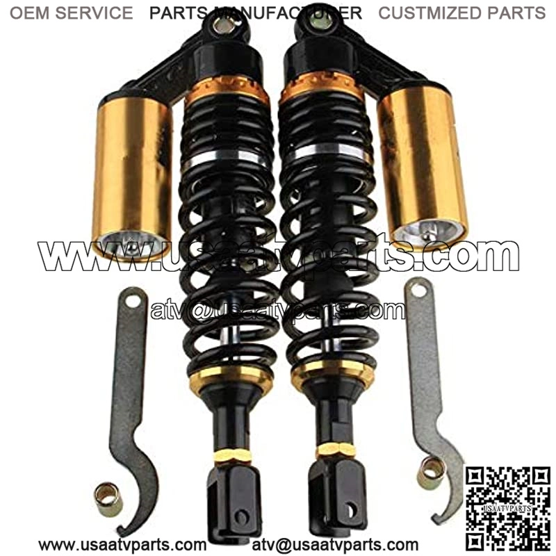 Universal for most 150cc~750cc street bikes, Karting(Go kart), Scooters and Moped Quad (ATV) with shocks of 280mm Length of Eye to ClevisBushing hole size: 12mm; Length between holes to clevis: 280mmA pair of rear motorcycle shock absorbers, made of aluminum and stainless steel;Dimension:Total Length:315mm (12 3/8″)Length of Eye to Clevis Eye Core:280mm (11″)Clevis Hole Diameter: 8mmClevis Inner Width: 20mmClevis Maximum Tensile Strength: 2,000 KgfSpring Thickness: 7mmSpring Width: