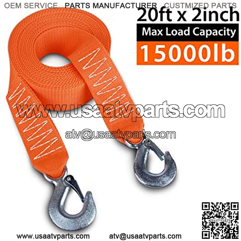 Super capacity of towing strap: Our Heavy Duty Tow Strap made from high-level polyester, 2″ wide, 20ft long heavy duty tow strap with 2 Hooks, Rated up to 6,8 tons max (15,000lb) load capacity.