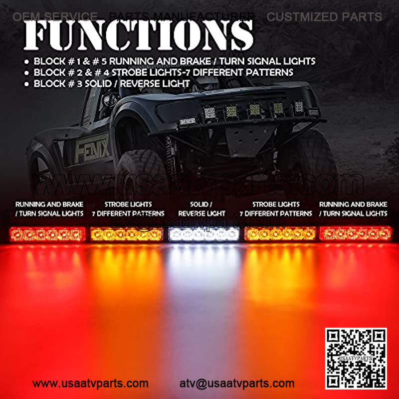 This 30 Inch Offroad Rear Chase LED Light Bar are Multi Functional with Running and Stop Lights, Reverse Light, and Strobe Functions, and have 7 Different Patterns for UTV, ATV, and Side by Sides. Brighter and more Effective than Standard LED Strobe Lights