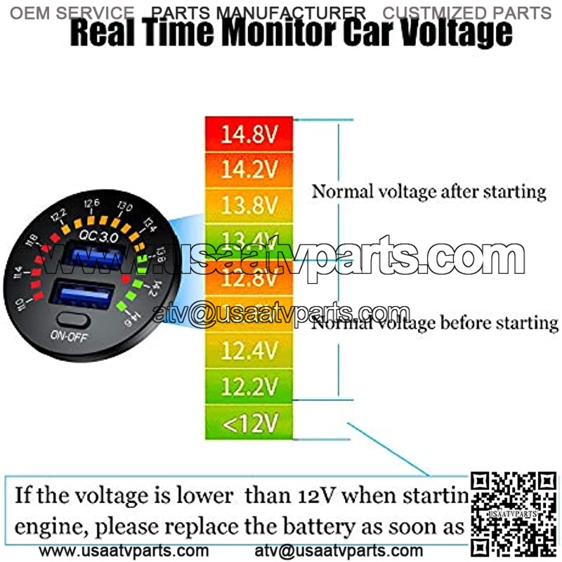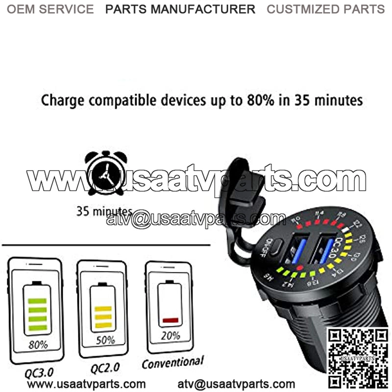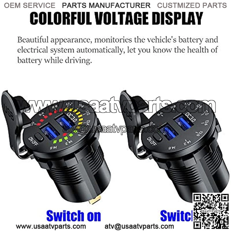 COLORFUL VOLTAGE DISPLAY ?C Upgraded version launched in July 2020, this 12V usb outlet with colorful voltmeter, technological appearance, displays the real-time voltage status of your vehicle, let you know the health of battery while driving.ON/OFF SWITCH ?C Features a on/off switch which controls the voltmeter and usb ports, save power and prevent the battery being drained when leave unused.QC3.0 DUAL USB ?C dual USB charger socket has two 18W / 3A QC3.0 fast charging ports, which is 4x faster than conventional chargers. Backwards compatible with Quick Charge 2.0 & 1.0, suitable for all popular USB devices.WIDE APPLICATION – Fits for 12V car, boat, marine, motorcycle, ATV, RV etc. This usb socket is suitable for charging iPhone 8/ 8 Plus/ X/ 7/ 6S, Samsung Note 9/ Galaxy S9/ S9+/ S8/ S8+/ S7, iPad, android tablets, power banks, video games controllers, sports watch etc.SAFETY PROTECTION – Certified by CE & ROHS with Over-charging, Over-current, over-heating and Short Circuit Protection