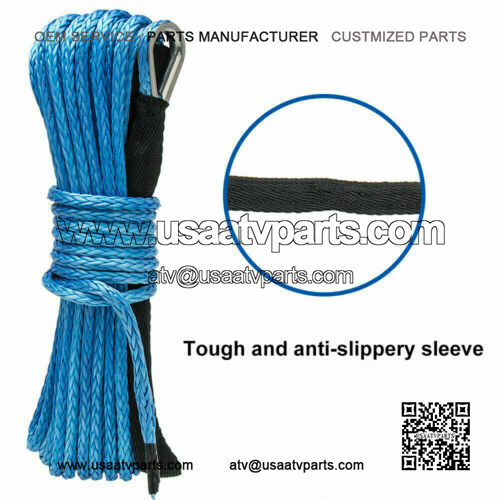 Feature:Color: BlueLength: 50ft (15 M)Diameter: 0.25 inch (6mm)Material: High Molecular PolyethyleneExtremely Light, Floats in Water.Minimal Stretch and Non Rotation.Stronger Than Traditional Steel Cables.Easy to Handle, No Sharp Frays.Easily Spliced.Good Resistance to UV and Chemicals.Workable below -20 degree centigrade.Fitment: Universal fits most car SUV ATVMaximum strength 4200kg 10,000 Lbs Tested and verifiedResists water absorption, providing an extra level of protection and durabilityOne end with 35mmx 20mm stainless steel eye-thimble with 29mm PVC sleeve and other end with straight finish with 10mm PVC sleeve