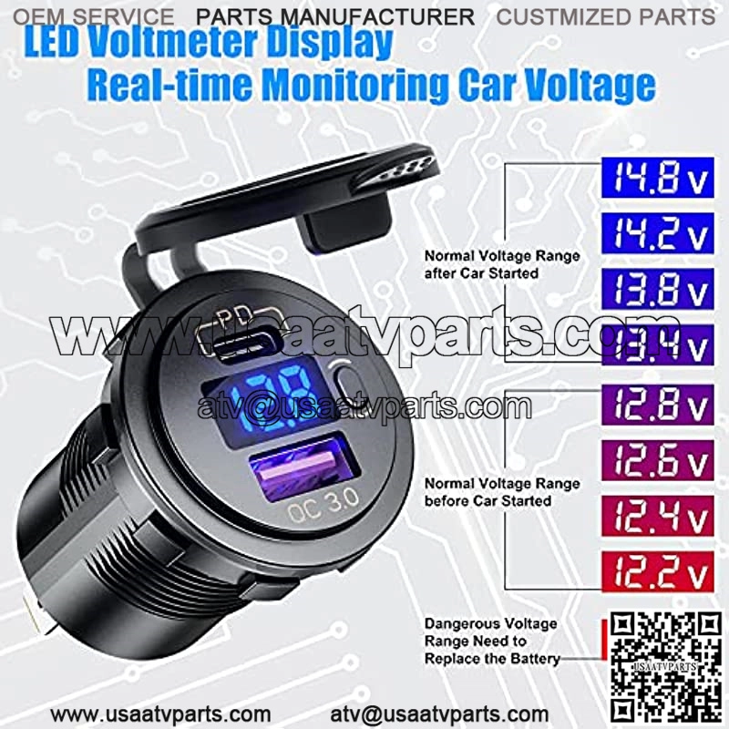 ??USB C + PD3.0??- Output: 5V/3A, 9V/3A, 12V/2.5A, 15V/2A, 20V/1.5A (30W Max) ; PD3.0 USB C Car Charger Socket devices that support power delivery at up to 30W. Intelligently identify your device and deliver the fastest and most efficient power.??Quick Charge 3.0??- Provides 4x faster charging speed to compatible devices. Max output at 18W, able to charge compatible devices up to 80% in just 35 minutes, completely backwards compatible with all versions of Quick Charge.??Fashion LED Voltmeter??- Built-in LED Voltmeter can show the car battery status in the screen. LED luminous digit figure for checking the data at night or in darkness. NOTE: The digital LED display only works when you connect it with battery.??ON/OFF Switch??- The dual usb charger built-in ON/OFF switch, which can save energy and extend the life of the product and devices. It saves electricity and does not consume energy when it is turned off.??Universal Compatibility??- Widely applied to DC 12V-24V Car, Truck, Boat, Marine, RV,