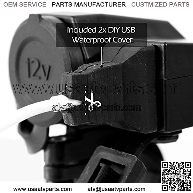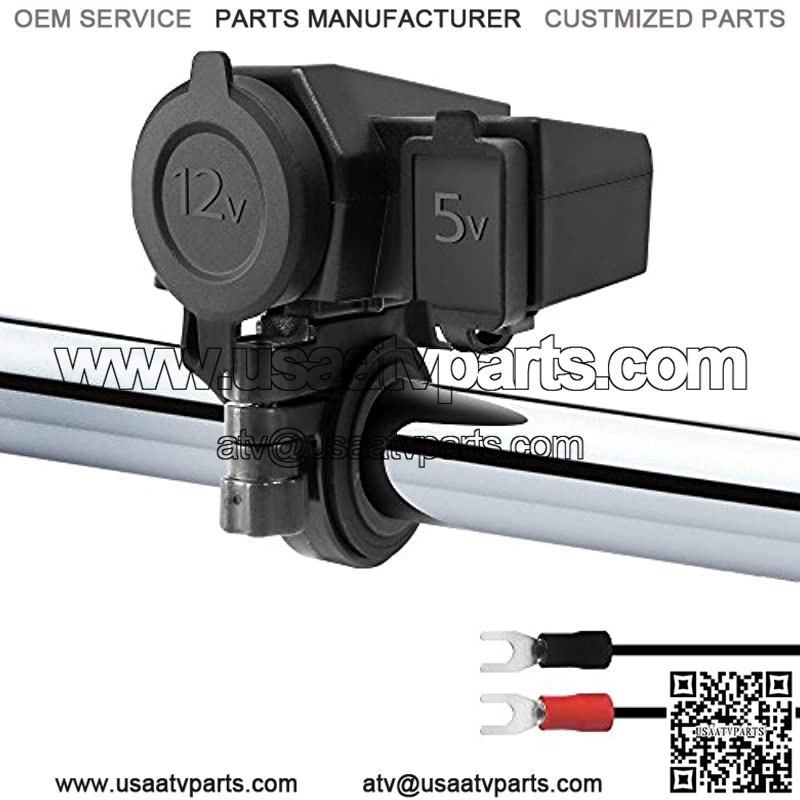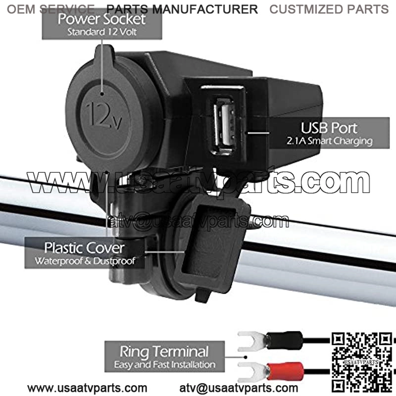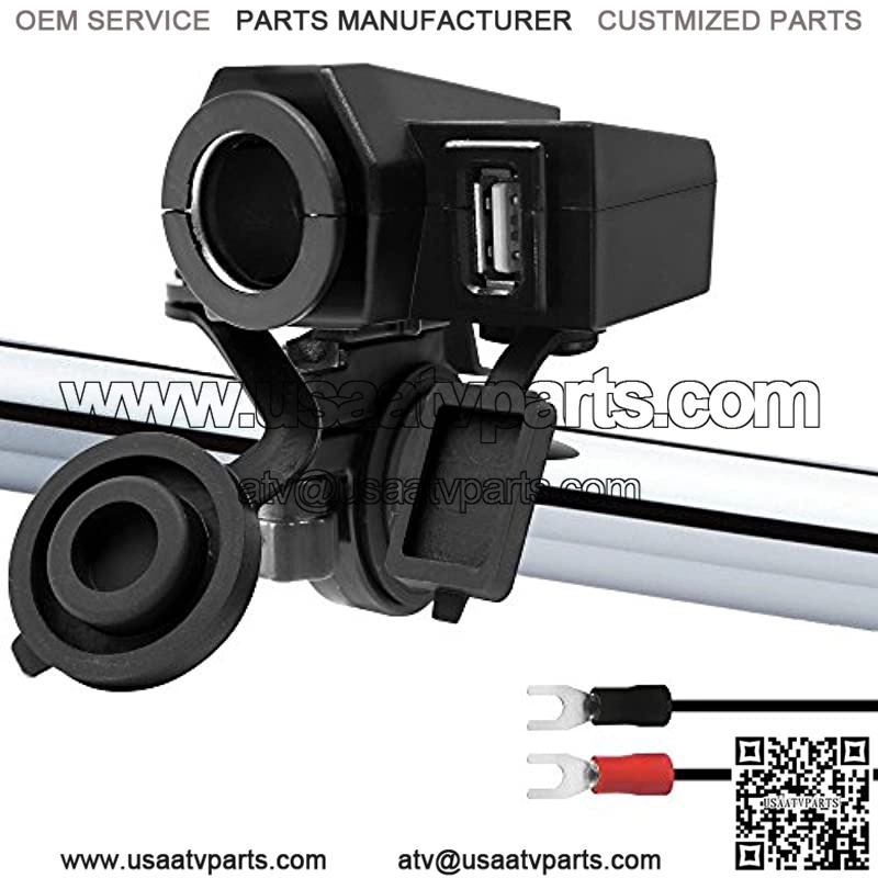 Waterproof 5V 2.1A USB Port Charger with 12V Car Cigarette Lighter Socket Outlet for motorcycle Harley Honda Yamaha Kawasaki Suzuki UTV ATV 4 Wheeler Polaris Included 3 x rubber inserts for 7/8, 1, 1 1/8?? handlebar sizes. Included 3M double sided 3M tape for flat surface mounting. Included 2 DIY USB rubber cover for waterproof while in use. Fast smart charging for all Smartphones, Camera, GPS, Tablet IP54 Waterproof and dust-proof cover for USB and Cigarette Lighter Socket. Great for outdoor usage 60?? long power extension wire with built-in fuse to ensure reliability and safety. Ring terminal for easy installation