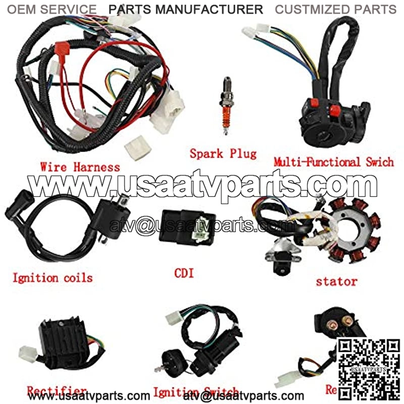 ??Package Content??: 1 x Wiring harness, 1 x CDI, 1 x Spark Plug, 1 x Ignition Coil With Lead, 1 x Solenoid Relay, 1 x Rectifier (Voltage Regulator), 1 x Ignition Switch (Waterproof), 1 x Multi-functional ATV Switch, 1 x Magneto Stator (8 Pole, 3 fixing holes).
